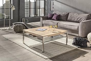 Couchtisch Wohnzimmertisch Mo Eiche Bianco 90x90 Cm Mit Ablage Aus Glas Stabiler Massivholztisch Aus Eichenholz Auf Gebursteten Edelstahlfussen